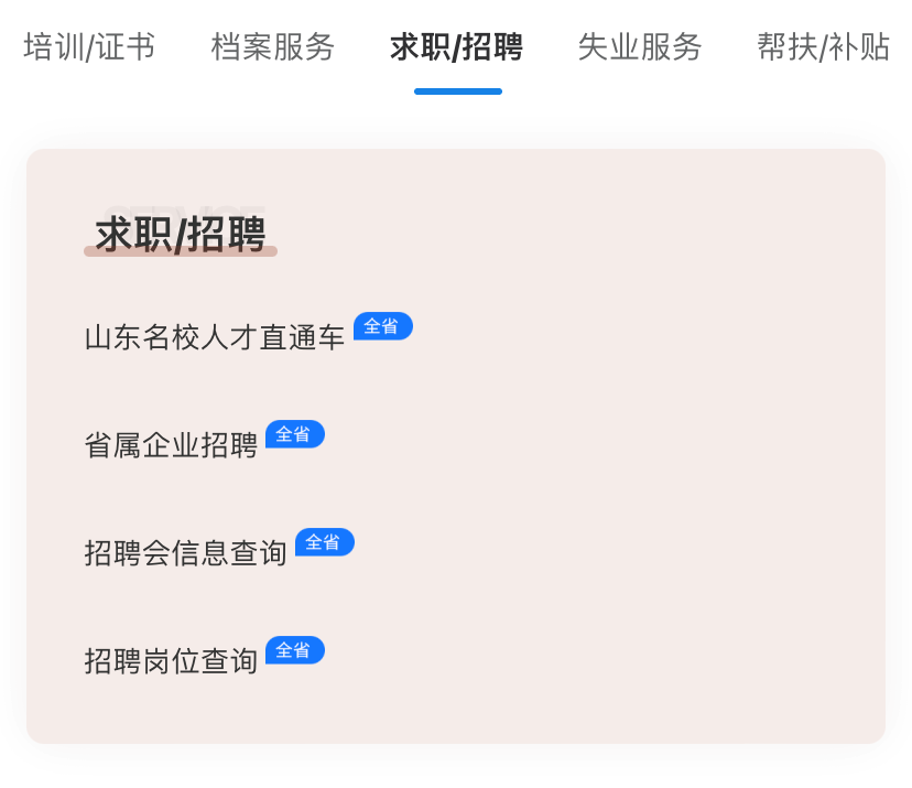 求职/招聘 还在为找工作而烦恼?招聘岗位、招聘会、人才对接活动……你需要的招聘信息在这里一站查收! 就业人才专区【求职招聘】板块涵盖山东名校人才直通车、省属企业招聘、招聘会信息查询和招聘岗位查询共四项招聘服务,为求职者提供官方权威信息,还可筛选岗位、投递简历,助你顺利迈出职业生涯第一步。