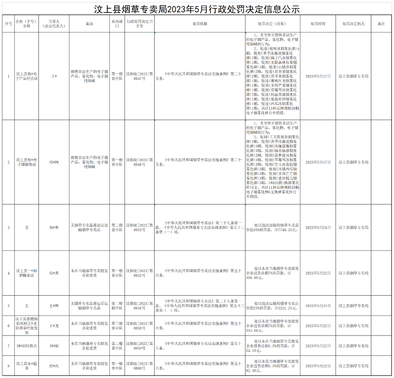 汶上县烟草专卖局2023年5月行政处罚决定信息公示