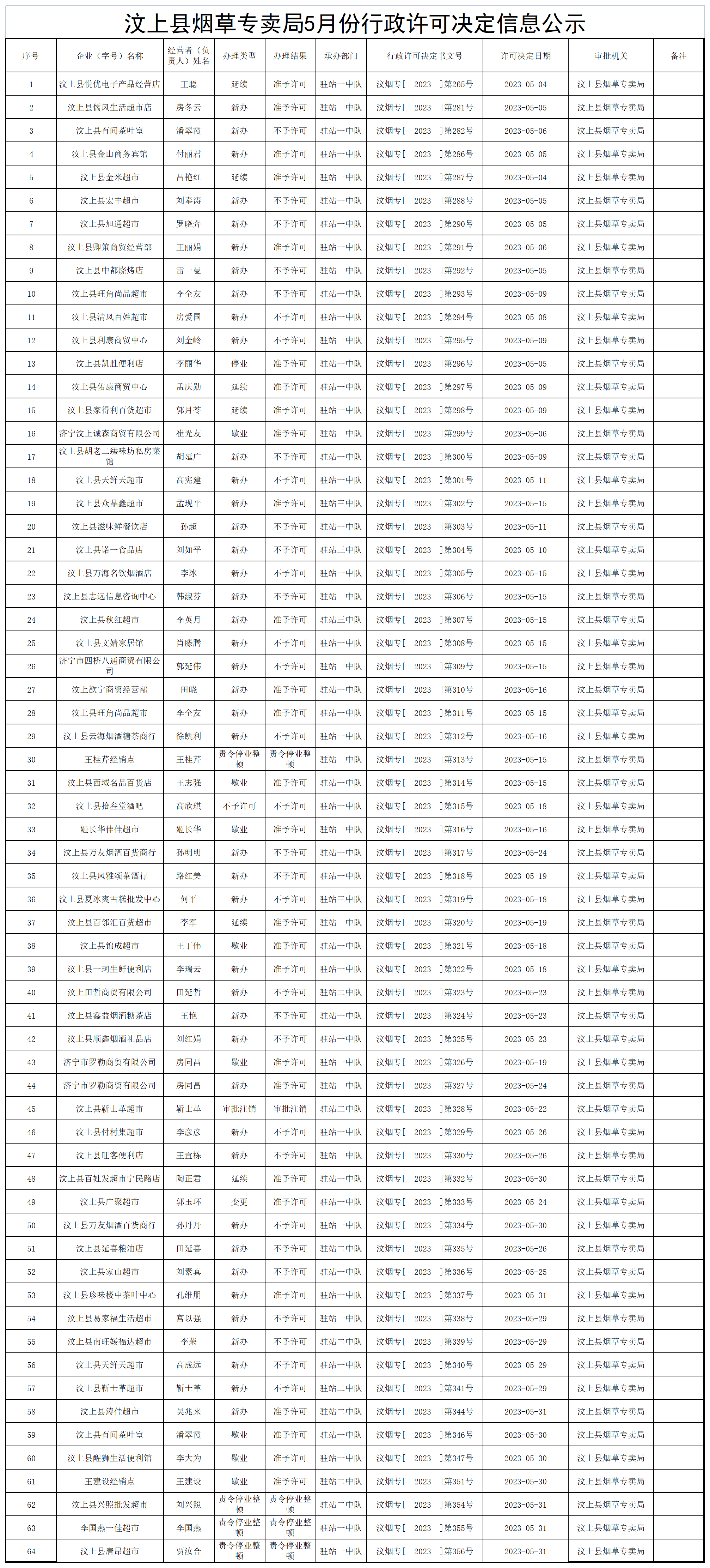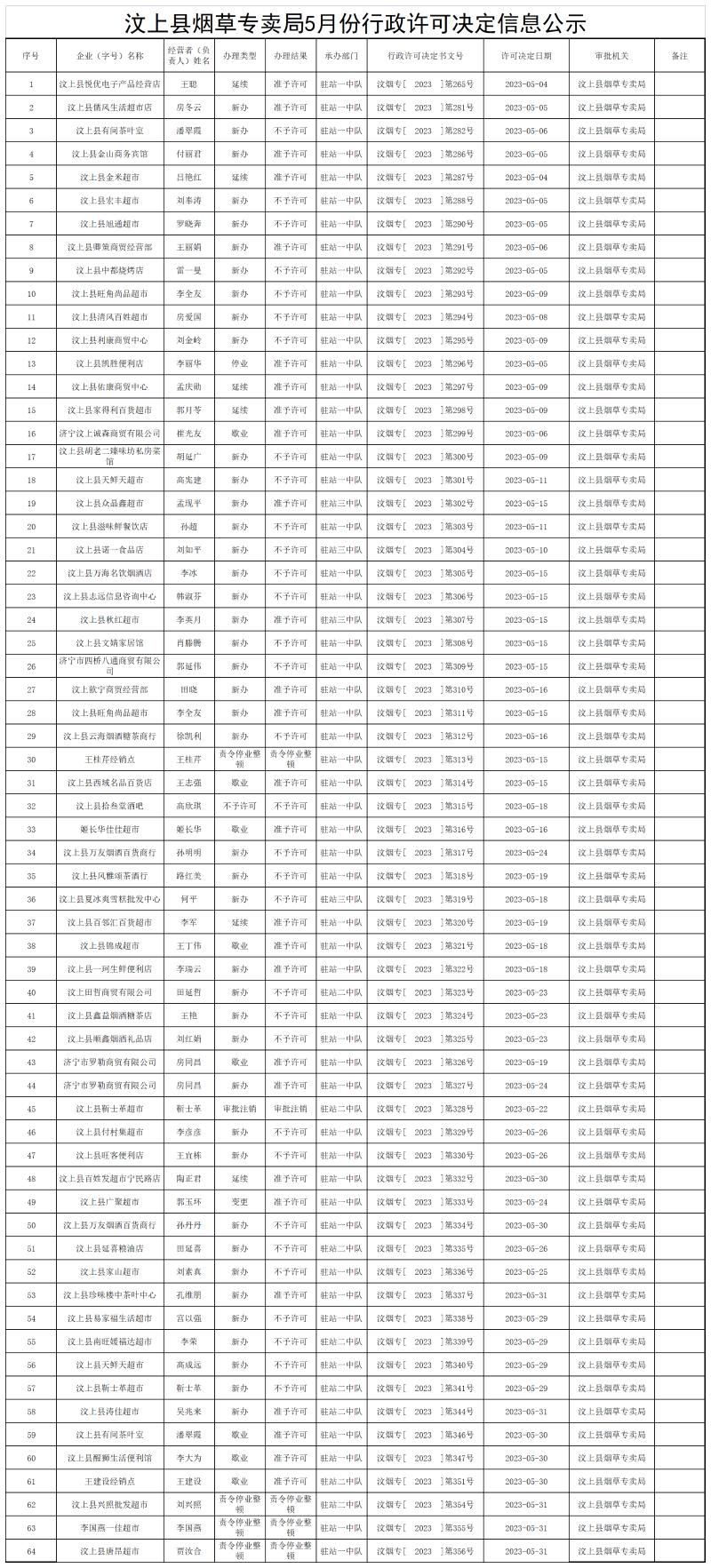 汶上县烟草专卖局5月份行政许可决定信息公示