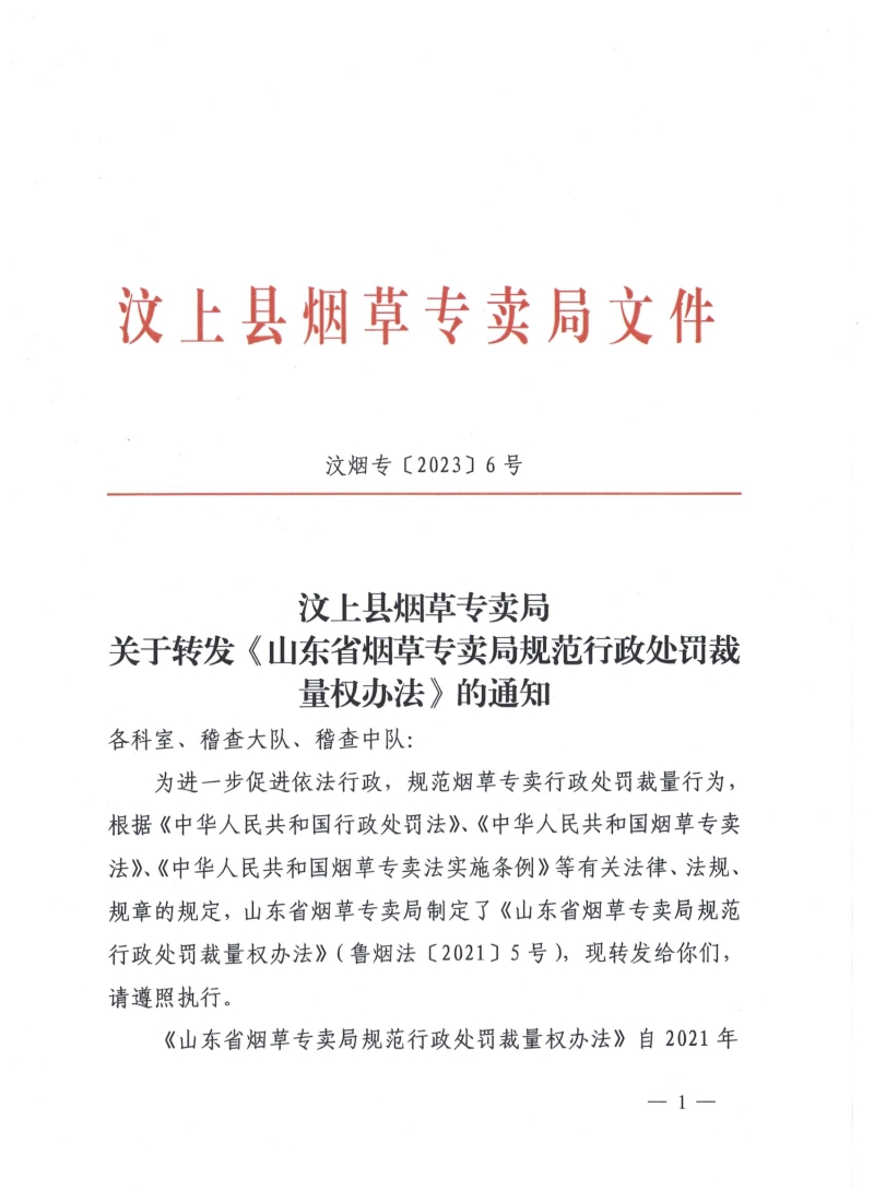 汶上县烟草专卖局关于转发《山东省烟草专卖局规范行政处罚裁量权办法》的通知