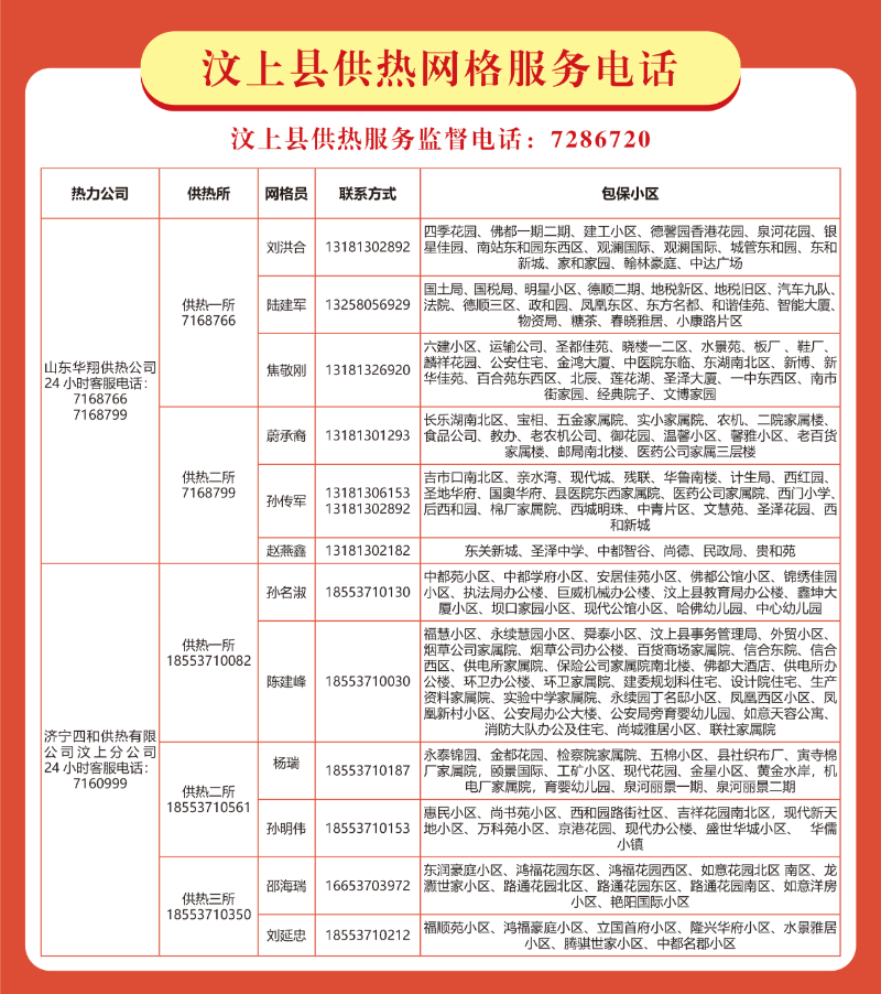 为向广大市民提供更加优质高效的供暖服务,2024-2025采暖季,济宁市继续推行“供暖网格管家”服务模式。如您遇到供暖方面问题,欢迎拨打各供热企业客服电话或者联系所在小区供热网格员,我们将第一时间为您服务。