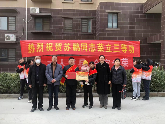 2月29日,中都街道党工委委员禚主任及中都街道退役军人服务站何主任、坝口社区工作人员一行,为荣立三等功的现役军人苏鹏家庭送去立功喜报、慰问金,让军人军属共享这份荣耀和喜悦。