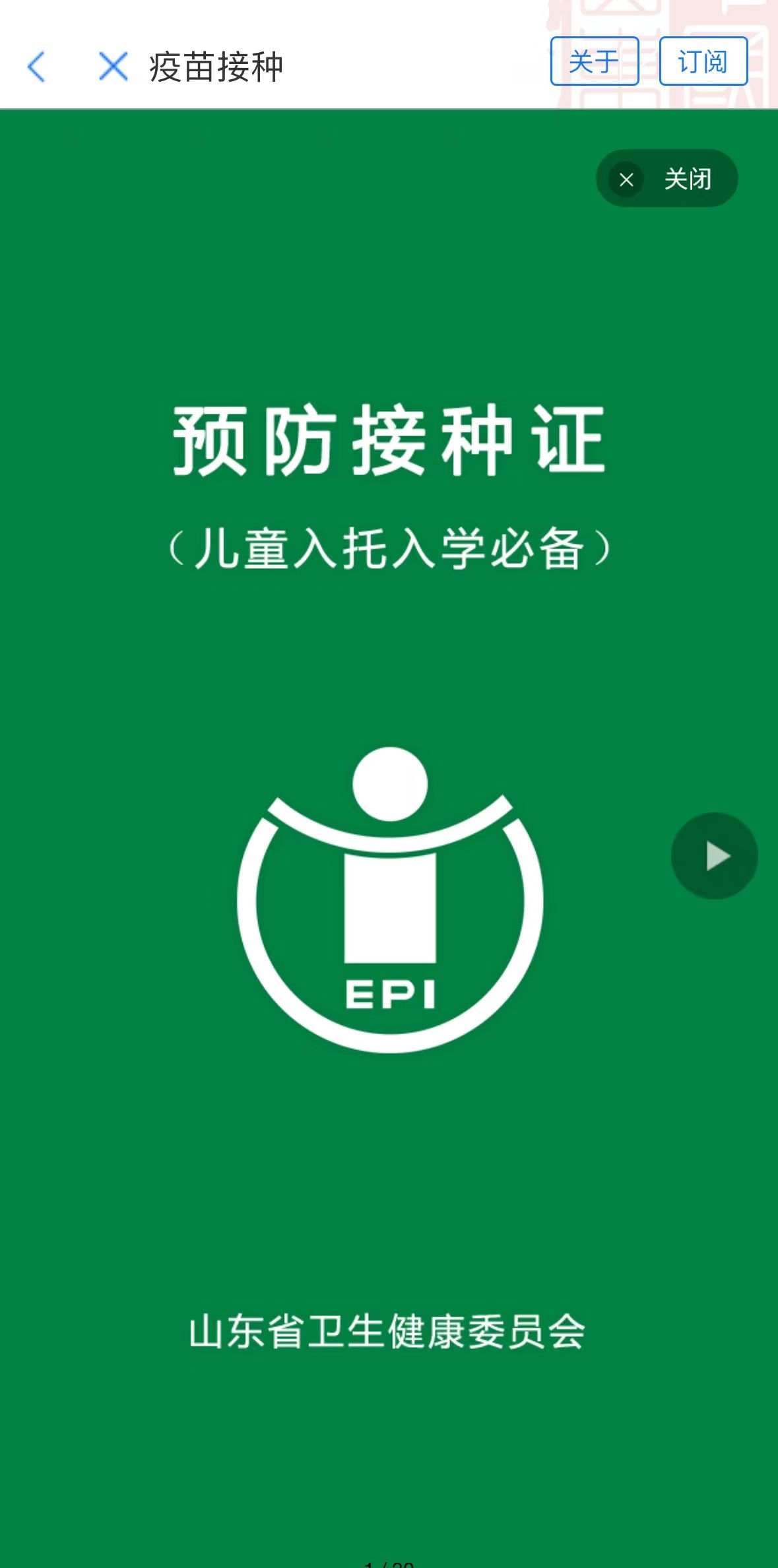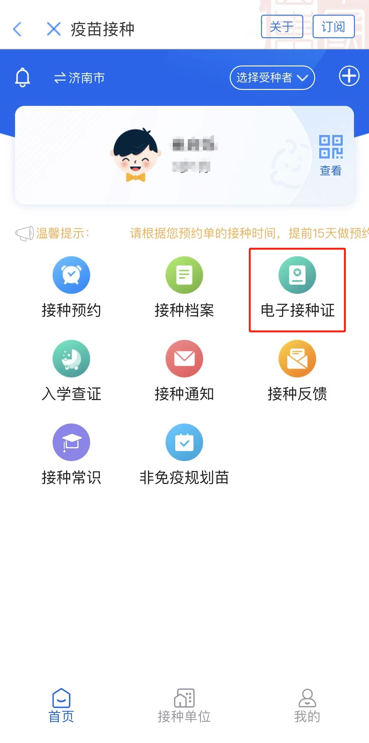 您家孩子需要补种吗? 快来“爱山东”“疫苗接种”服务 确认脊灰灭活疫苗的接种情况 及时补种疫苗吧! 家长朋友可以通过“爱山东”-“疫苗接种”服务绑定孩子的接种证信息,随时随地查看电子版接种证,确认接种疫苗的名称、剂次、接种时间等详细内容,还可查找附近的接种单位、进行接种预约、办理入学查证等。 绑定儿童信息 进入“爱山东”APP、支付宝、微信小程序,首页搜索“疫苗接种”进入服务,如果家长尚未绑定儿童信息,需先点击右上角“+”,扫描孩子的接种证条码或输入受种者信息完成绑定。