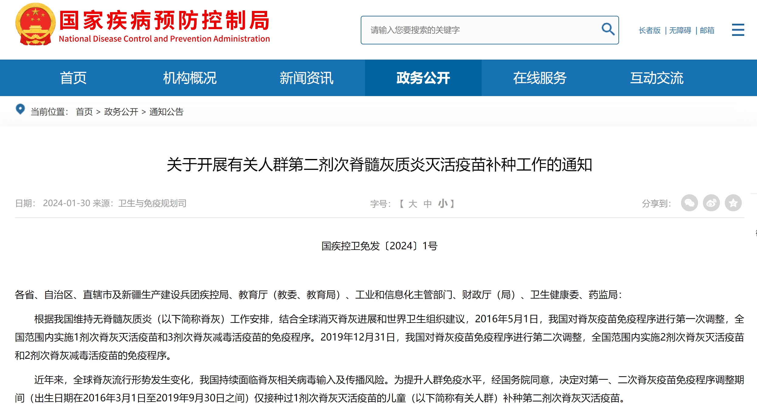 为提升人群免疫水平,根据国家疾病预防控制局等6部门联合发布的《关于开展有关人群第二剂次脊髓灰质炎灭活疫苗补种工作的通知》,出生日期在2016年3月1日至2019年9月30日之间,仅接种过1剂次脊灰灭活疫苗的儿童,需在2024年6月30日前补种第二剂次脊灰灭活疫苗。