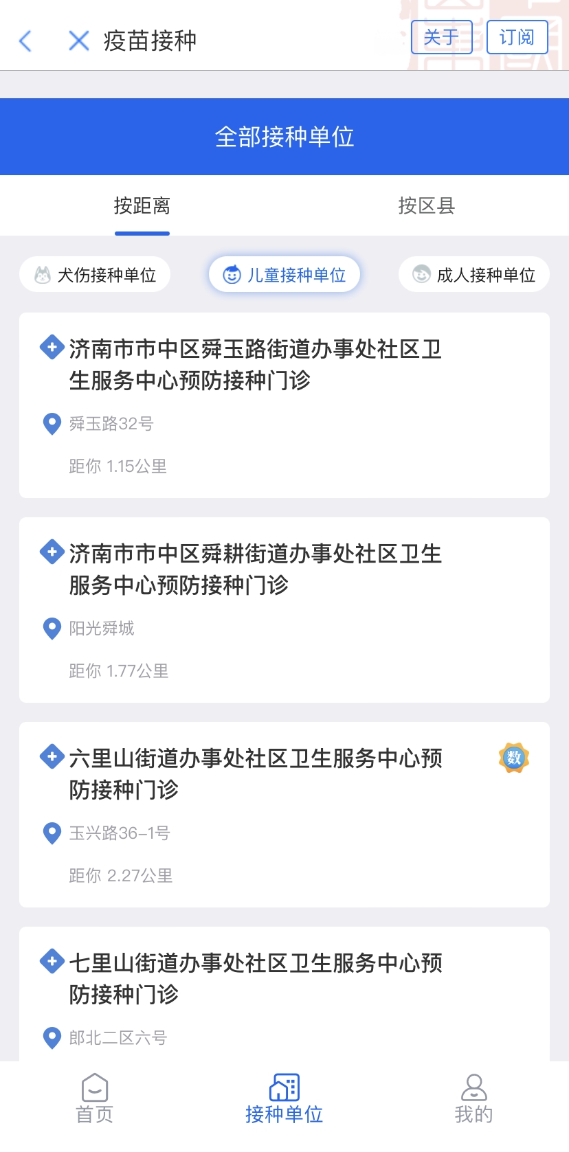 接种单位查询 确认需补种疫苗后,家长可以到儿童原接种单位进行疫苗接种,或者点击底部“接种单位”,选择“儿童接种单位”,查看就近接种门诊的详细地址、联系方式,电话咨询相关问题,前往接种脊灰灭活疫苗。