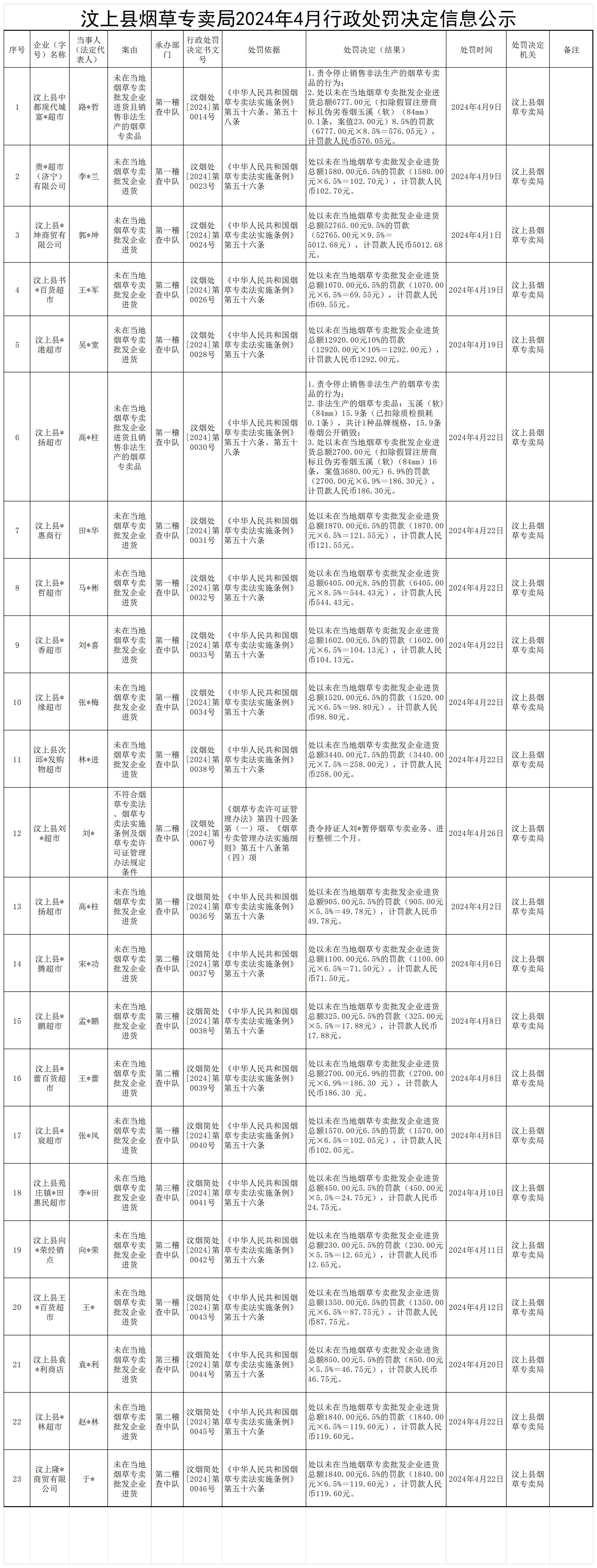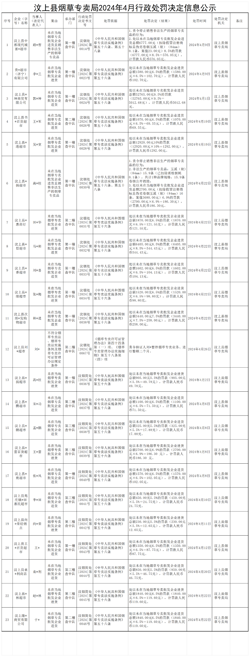 汶上县烟草专卖局2024年4月行政处罚决定信息公示