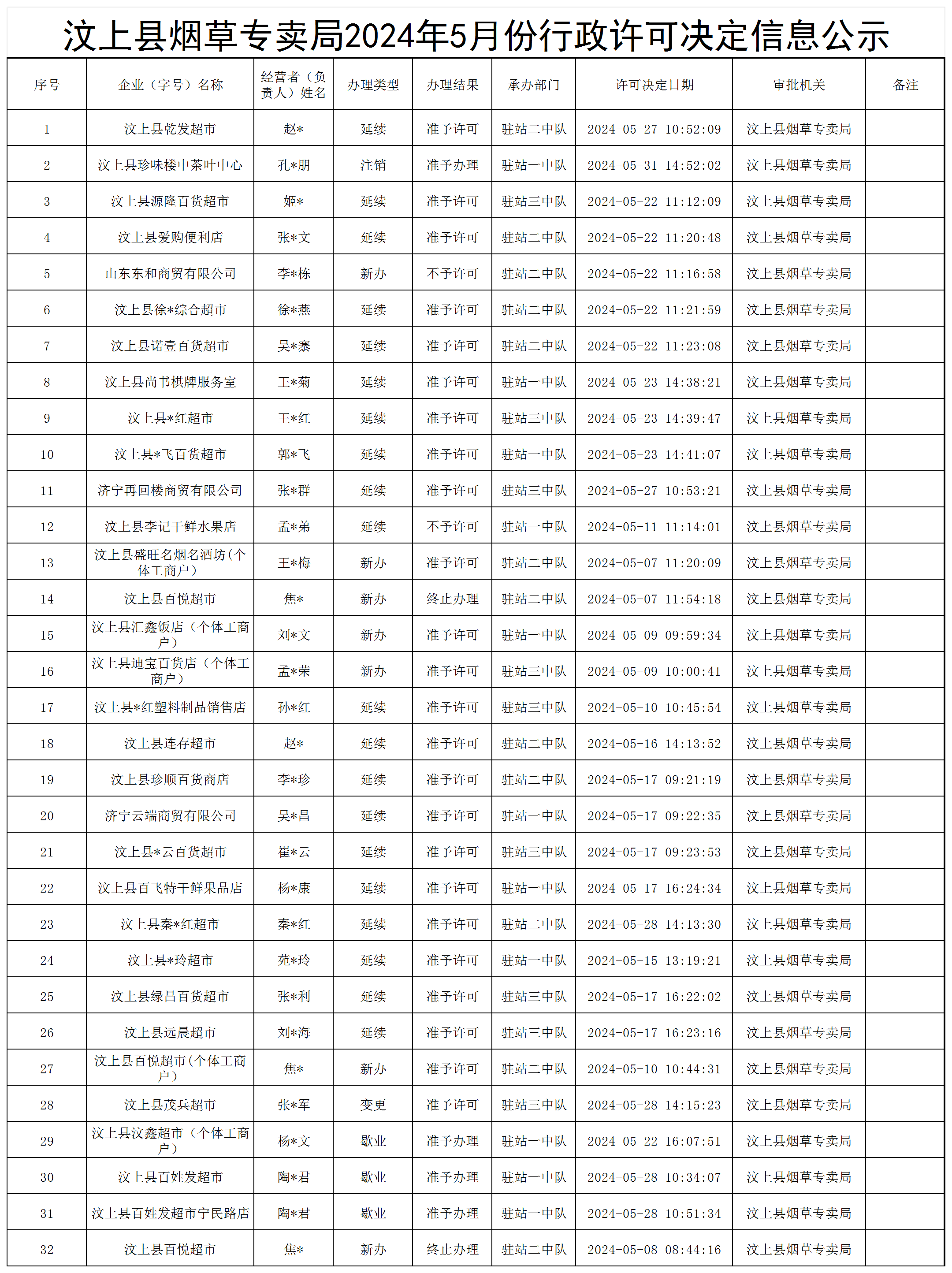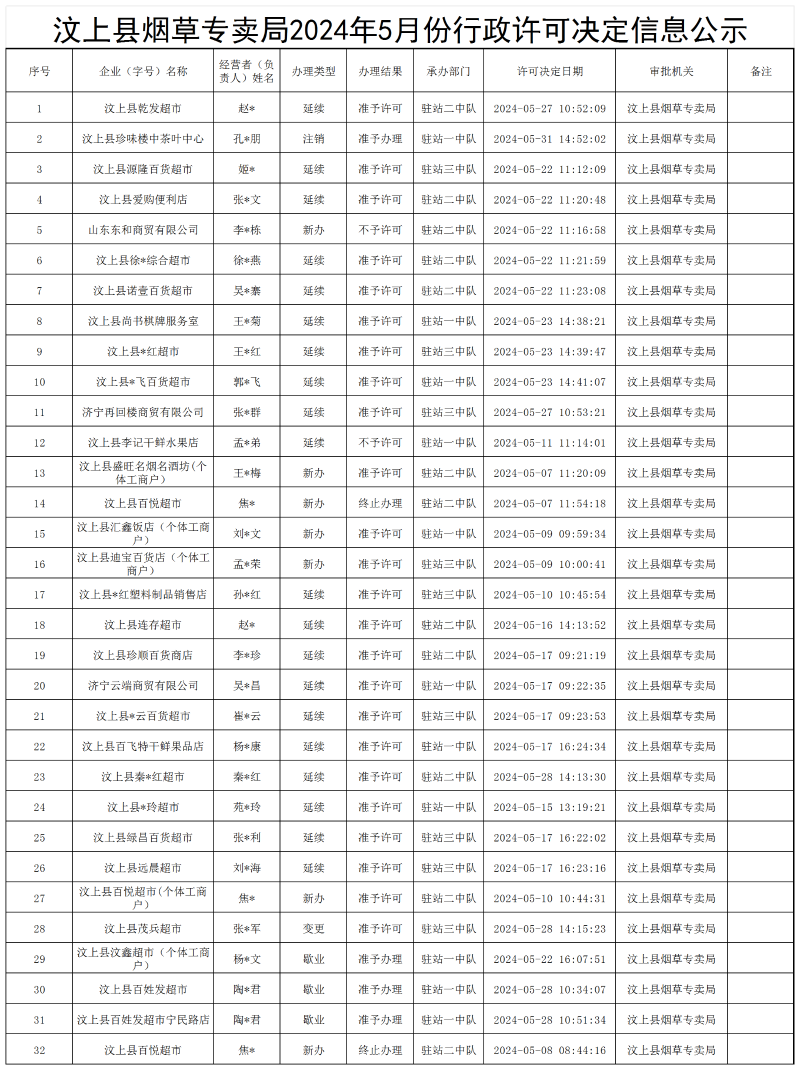 汶上县烟草专卖局2024年5月份行政许可决定信息公示