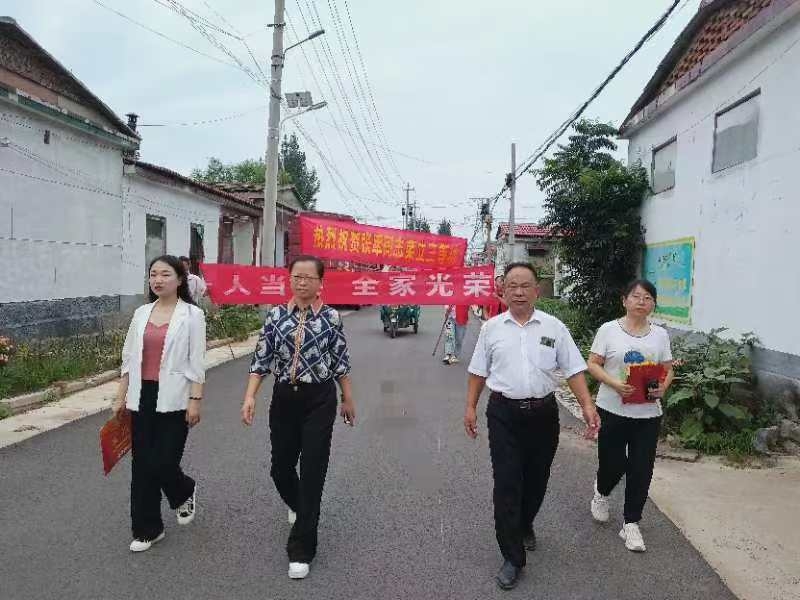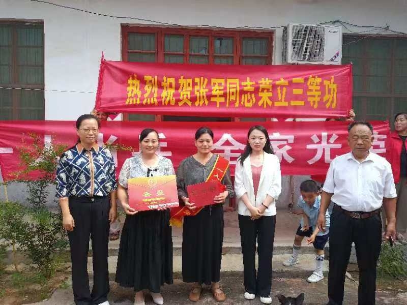 军营建功勋、亲属享荣光。8月1日上午,军屯乡党委副书记、乡长刘桂霞,副乡长高颖,带领军屯乡退役军人服务站到军屯乡西四(商议集)村开展送立功喜报活动,为现役军人张军家属送去最好的“八一”礼物。