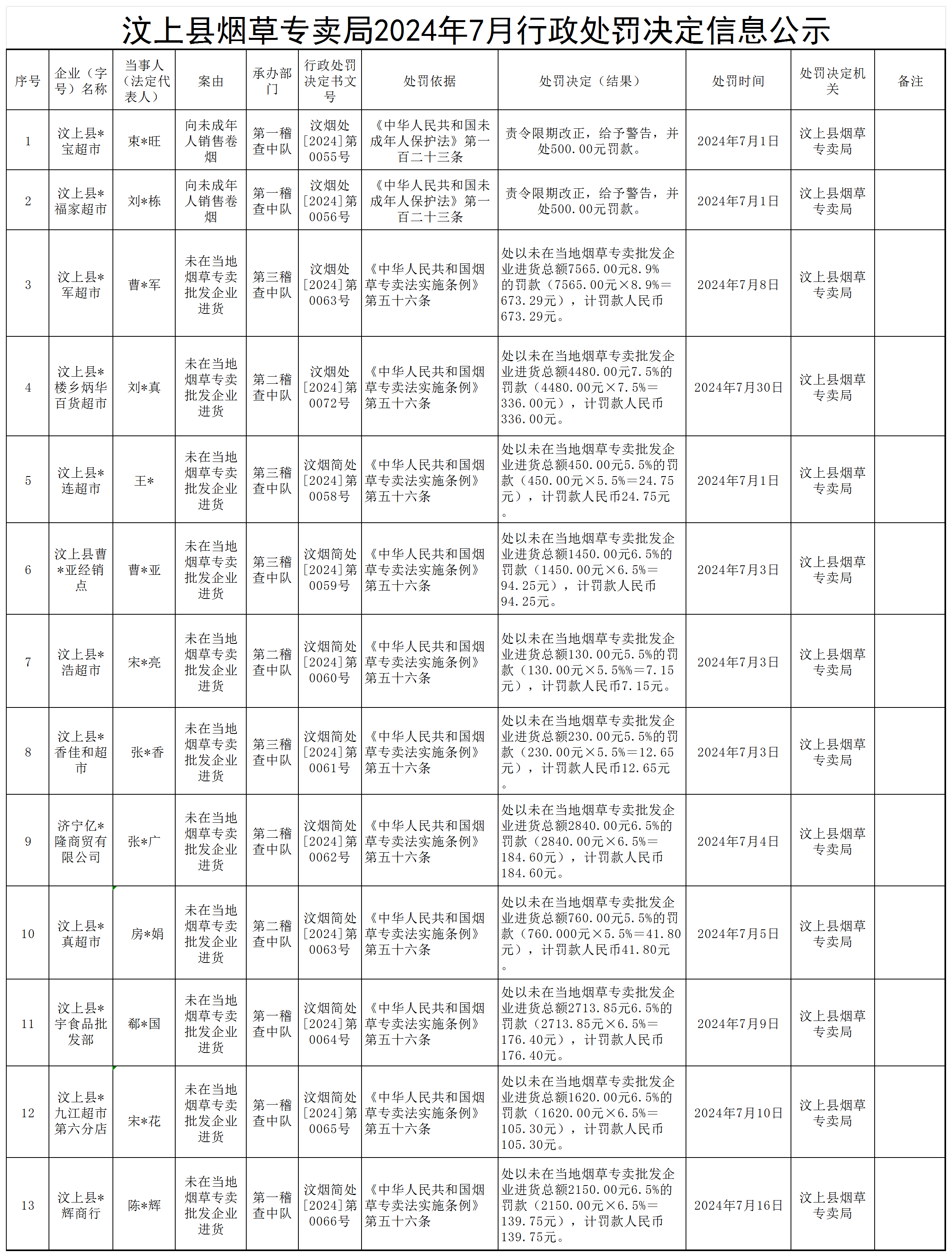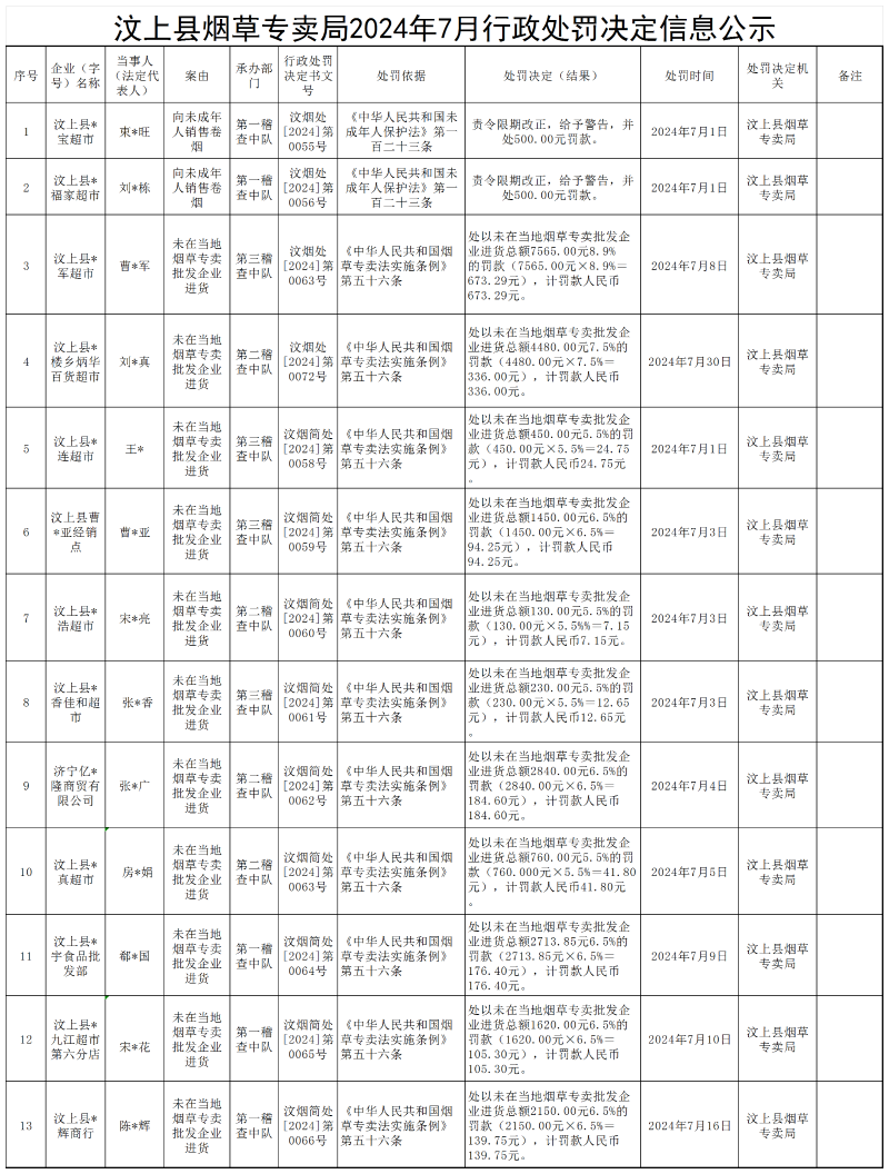汶上县烟草专卖局2024年7月行政处罚决定信息公示