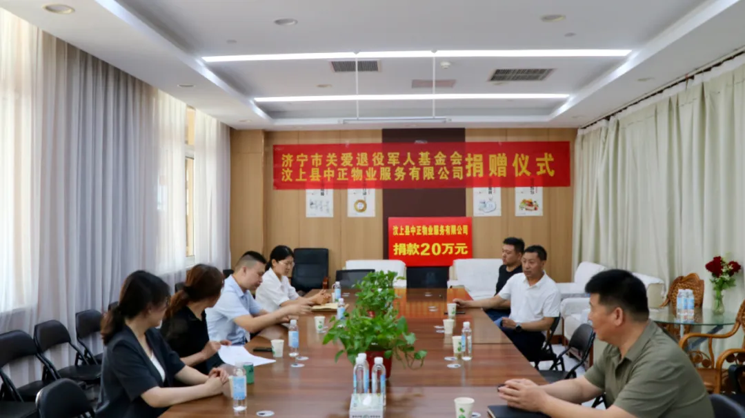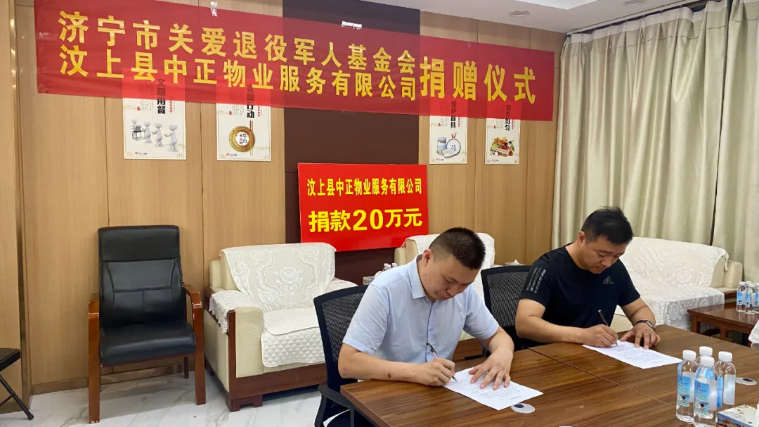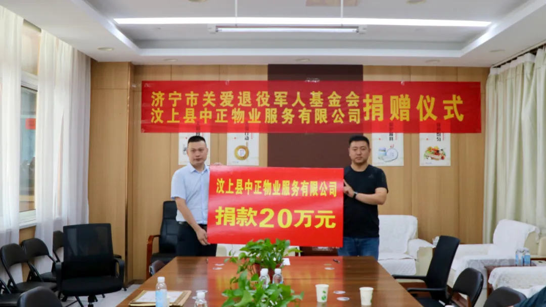 近日,汶上县中正物业服务有限公司向济宁市关爱退役军人基金会捐赠20万元人民币善款,用实际行动践行了企业的社会责任和热心参与公益事业的奉献担当,为社会各界树立了良好的榜样。