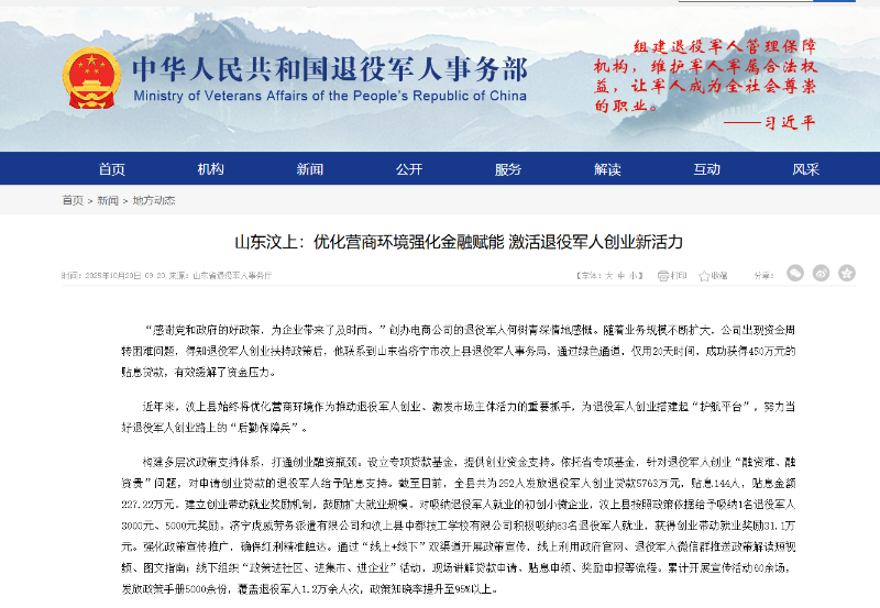 退役军人事务部刊登汶上县典型工作做法——山东汶上:优化营商环境强化金融赋能 激活退役军人创业新活力 |