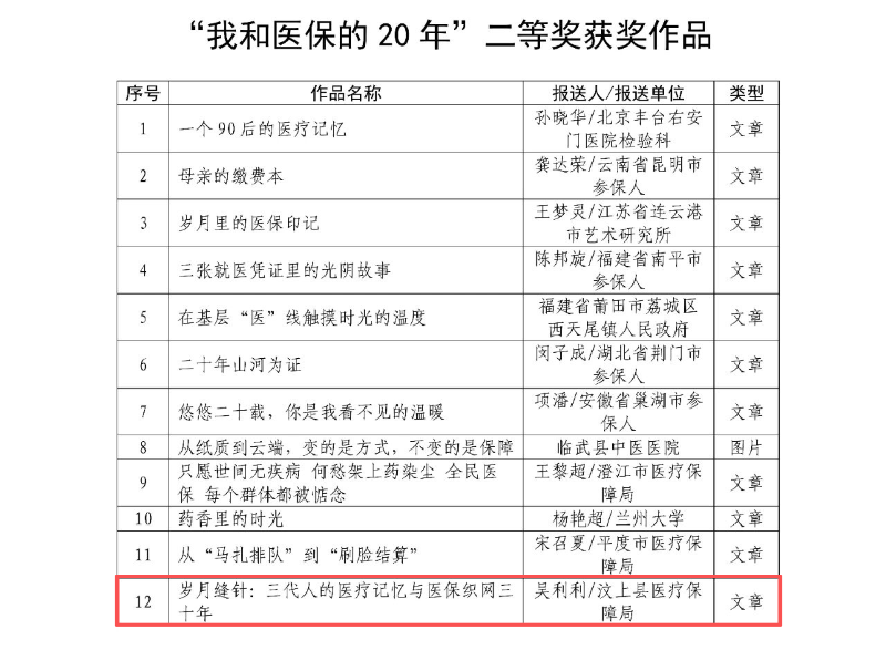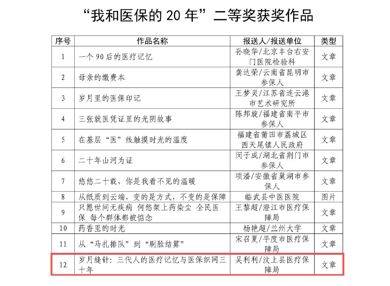 今年5月,国家医保局开展“我和医保的20年”优秀作品征集活动,汶上县医疗保障局申报的《岁月缝针:三代人的医疗记忆与医保织网三十年》荣获国家医保局二等奖,全市唯一。