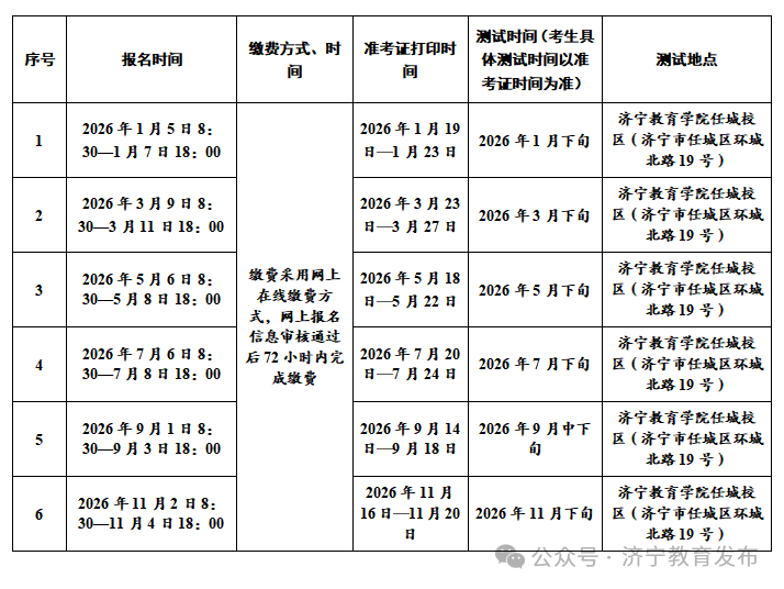 为满足广大考生参加普通话水平测试的需求,进一步提升山东省普通话水平测试社会服务中心服务水平,做好2026年普通话水平测试工作,根据我市实际,特制定如下方案。 一、测试时间、地点安排 济宁市2026年面向社会人员的普通话水平测试计划安排6期。具体安排如下: 二、报名范围 凡在我省工作、生活的人员(港澳台人员和外籍人员需在我省学习、工作、生活3个月以上),均可按规定的测试时间,报名参加测试。 特别提醒:根据《山东省普通话培训测试机构管理办法》规定,高校学生不在报名范围之内。 三、报名方式及报名流程 1.报名方式:测试采用网上报名方式。 2.报名流程:考生登录“国家普通话水平测试在线报名系统”(http://bm.cltt.org)进行报名,首次登录需要进行注册。具体流程为:登录账号→报名入口→山东→我要报名→山东省普通话培训测试社会服务中心→测试时间→阅读报名须知→填写报名信息(所在单位一栏填写工作单位或家庭住址)→信息核对→信息审核通过→在线缴费→报名查询。考生依据相应测试日期任务进行报名,个人具体测试时间以准考证为准。 3.报名注意事项 (1)照片要求为本人近期免冠白底电子版照片,规格为390×567像素,支持JPG/JPEG/PNG格式,1M以内。照片要求清晰、端庄、正面、免冠、白底彩色(参照证件照标准),不符合要求的照片将审核不通过,该照片为准考证照片。考试当天现场采集照片为证书照片,采集后照片后期不能修改,请合理着装。 (2)“从事职业”一栏选择考生目前所从事职业,无对应项的考生选择“社会其他人员—其他类”。“所在单位”一栏填写考生单位名称,未参加工作的考生填写家庭住址。 (3)带*的栏目为必填内容,填写报名信息时,考生信息务必正确填写。 (4)在线报名信息填报后,考生还需通过报名网站上方“报名查询”及时查看个人报名信息审核情况,审核通过需要在线缴费,如有审核不通过或者审核待修改信息,请及时处理。报名截止后未及时修改的系统自动取消报名信息。报名时间截止,系统将自动关闭。 (5)测试前一周左右,考生登录“国家普通话水平测试在线报名系统”(http://bm.cltt.org),进入后在页面上方点击“准考证打印”,完成准考证打印。 四、测试费用标准及缴费流程 普通话水平测试收费标准按山东省发展和改革委员会、山东省财政厅《关于明确普通话水平测试收费标准的通知》(鲁发改成本〔2022〕222号)文件规定执行,每人次50元。测试缴费采取在线缴费,请考生在信息审核通过后72小时内完成缴费,未及时缴费的系统自动取消报名。如本人弃考或个人原因未按时参加考试,不予退款。 五、测试方式、流程 1.测试方式:本次测试按照国家语委规定,从2023年4月1日起启用新的测试系统进行测试。采用人脸防作弊系统,考生需配合测试中心采集人脸信息后方能登录考试。同时新规程取消了备测室和备测时间。考生在信息采集时,由系统随机分配考试机位和考试试卷,请各位考生做好充分的测前准备。考生可在报名网站查看“测前须知”,了解测试详细内容。题型包括读单音节字词、读多音节词语、朗读短文、命题说话。第四道命题说话有2道题目,考生需在测试环节中自主勾选,否则默认为第一道题,考生勾选后有30秒的时间准备(不得使用纸笔),说话时长为3分钟。 2.测试流程为:考生报到→核对证件→候测→信息采集→测试→离场。 3.现场测试:测试时间、地点以准考证为准,请考生持准考证和身份证原件,提前30分钟到指定考场报到。信息采集现场需刷身份证,请考生考前准备好身份证原件,无身份证或临时身份证不得参加考试。迟到30分钟以上者,原则上应取消当次测试资格。 六、成绩查询及证书发放 1.成绩查询:测试结束后30个工作日左右(如有一级甲等的成绩认定顺延15个工作日),考生可登录“国家普通话水平测试信息网”(https://www.cltt.org/#/scoreQuery)或“国家普通话水平测试在线报名系统”(http://bm.cltt.org)查询。根据《普通话水平测试管理规定》第十五条的规定,普通话水平测试等级证书分为纸质证书和电子证书,二者具有同等效力。纸质证书遗失的,不予补发,考生可通过“国家政务服务平台”查询测试成绩,查询结果与证书具有同等效力。 2.纸质证书领取:测试完成到成绩公布48小时内,如需邮寄证书的考生可登录报名网站,点击“证书邮寄”填写个人信息,待国家语言文字工作部门统一印制后邮寄给考生。未及时填写邮寄信息或选择自取的考生,待本测试中心收到证书后会在济宁市教育局官网、济宁教育发布微信公众号、济宁教育学院微信公众号发布证书领取公告,届时考生可根据公告提示进行领取。 根据《普通话水平测试规程》第二十八条规定:“应试人应及时领取纸质证书。自成绩发布之日起1年后未领取的纸质证书,由测试机构按照内部资料予以清理销毁。” 七、其他注意事项 1.本测试中心不组织普通话水平测试相关培训,不指定相关教材。山东省普通话培训测试社会服务中心(原济宁市普通话培训测试中心)是经山东省语委办授权的济宁市唯一面向社会人员进行普通话水平测试的定点机构,不委托任何社会机构参与报名工作,切勿轻信社会上各种非法中介和个人“助考”的蛊惑,保护好自己的个人信息,避免上当受骗。一旦您将个人信息透漏给不法分子,您将自行承担由此产生