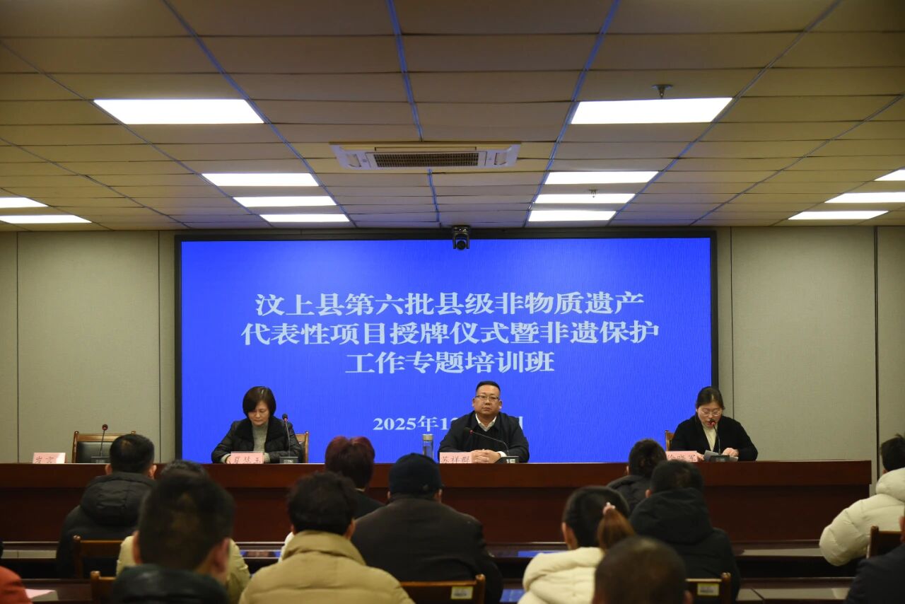 12月26日,汶上县第六批县级非物质文化遗产代表性项目授牌仪式暨非遗保护工作专题培训班圆满举办。县政协副主席、县文化和旅游局局长苏祥群,县文化和旅游局党组书记徐晓军,县文化和旅游局二级主任科员夏慧玉,各镇街综合文化站站长、第六批县级非遗项目负责人等参加活动。