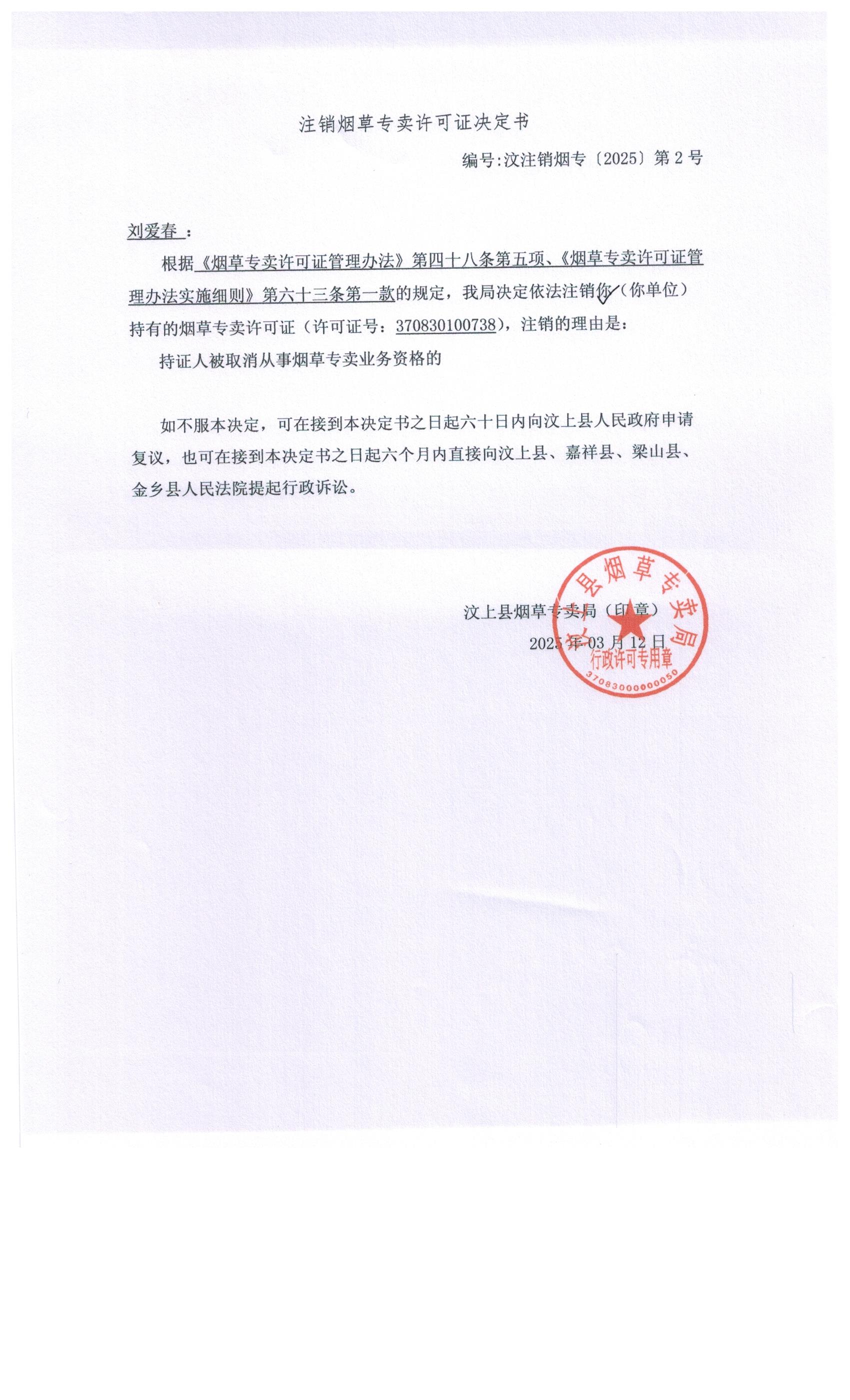 公告送达注销烟草专卖许可证决定书(汶注销烟专[2025]第2号)