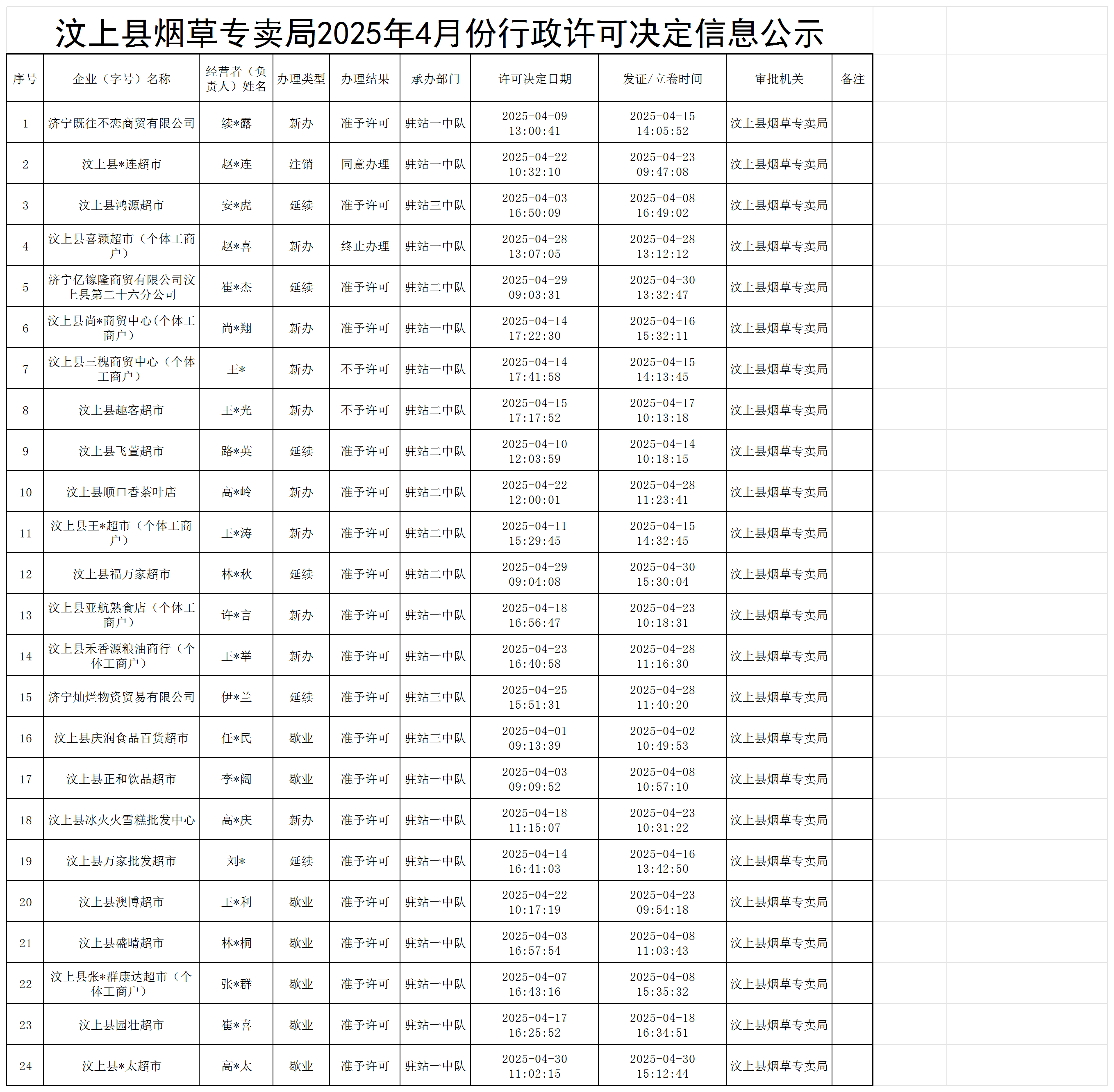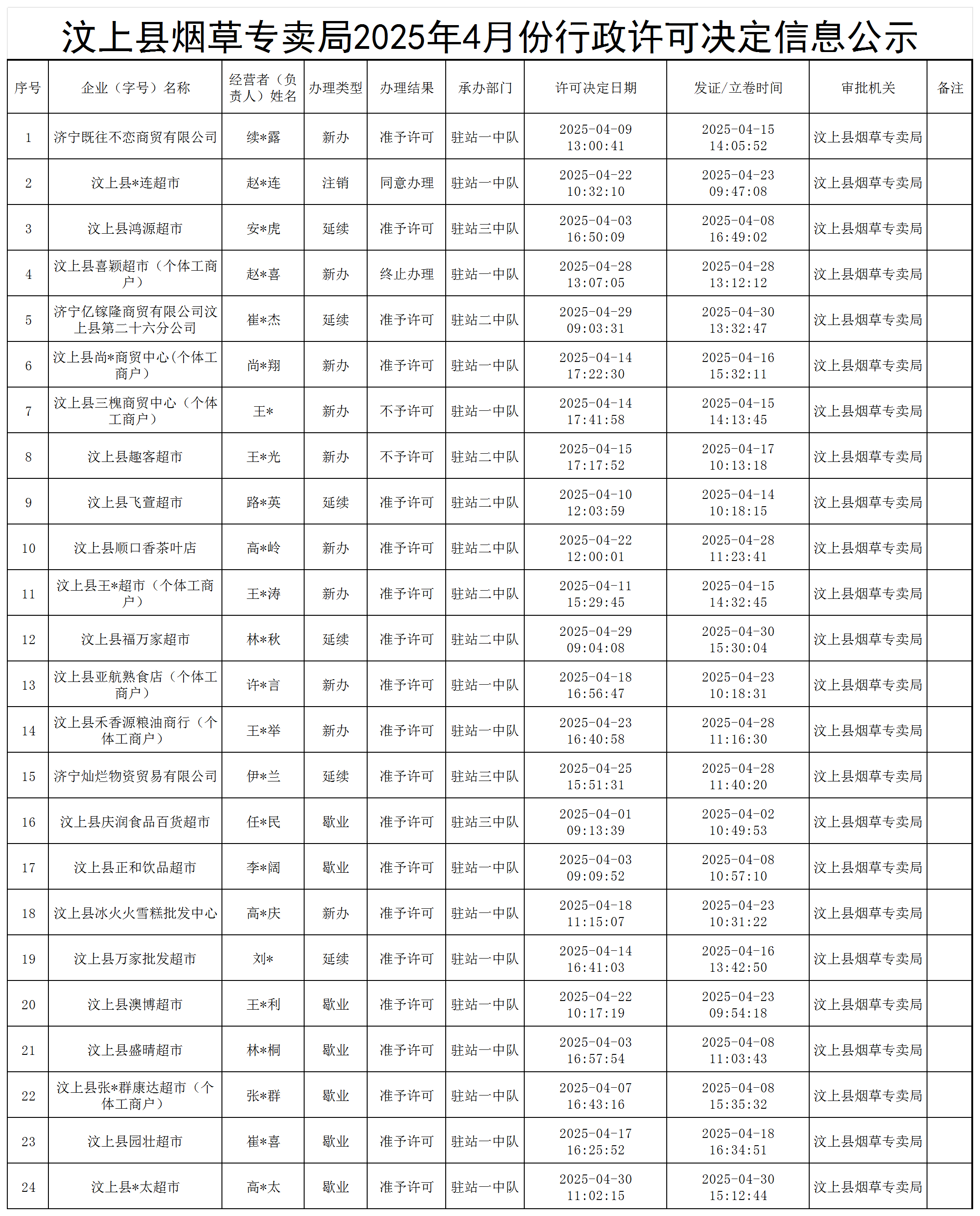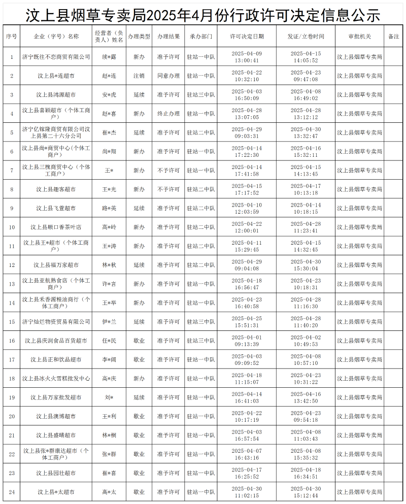 汶上县烟草专卖局2025年4月份行政许可决定信息公示