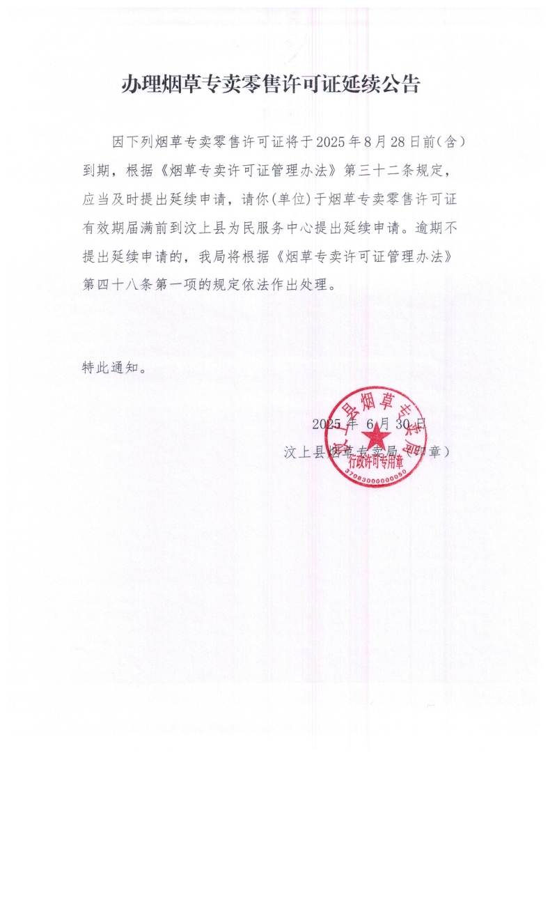 汶上县烟草专卖局办理烟草专卖零售许可证延续通知表.xls