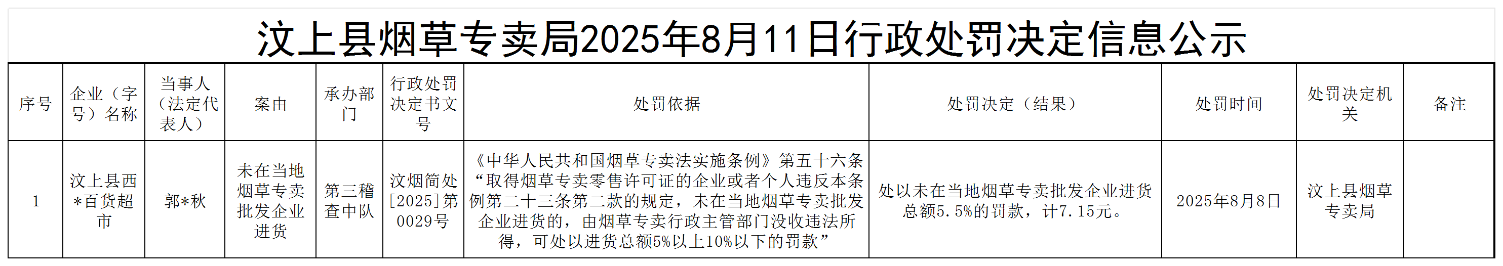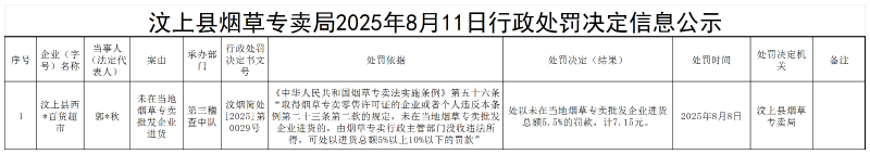 汶上县烟草专卖局2025年8月11日行政处罚决定信息公示