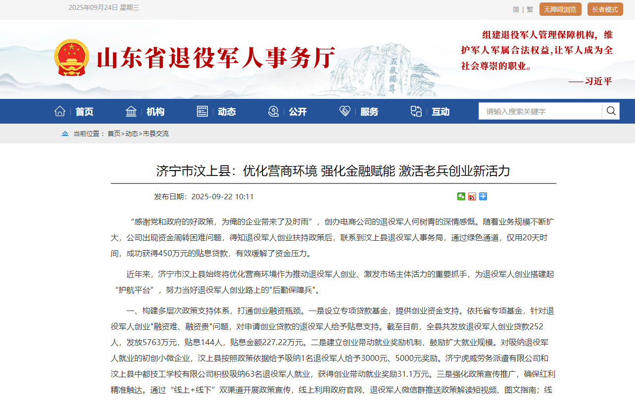 “感谢党和政府的好政策,为俺的企业带来了及时雨”,创办电商公司的退役军人何树青的深情感慨。随着业务规模不断扩大,公司出现资金周转困难问题,得知退役军人创业扶持政策后,联系到汶上县退役军人事务局,通过绿色通道,仅用20天时间,成功获得450万元的贴息贷款,有效缓解了资金压力。 近年来,济宁市汶上县始终将优化营商环境作为推动退役军人创业、激发市场主体活力的重要抓手,为退役军人创业搭建起“护航平台”,努力当好退役军人创业路上的"后勤保障兵"。 一、构建多层次政策支持体系,打通创业融资瓶颈。一是设立专项贷款基金,提供创业资金支持。依托省专项基金,针对退役军人创业"融资难、融资贵"问题,对申请创业贷款的退役军人给予贴息支持。截至目前,全县共发放退役军人创业贷款252人,发放5763万元,贴息144人,贴息金额227.22万元。二是建立创业带动就业奖励机制,鼓励扩大就业规模。对吸纳退役军人就业的初创小微企业,汶上县按照政策依据给予吸纳1名退役军人给予3000元、5000元奖励。济宁虎威劳务派遣有限公司和汶上县中都技工学校有限公司积极吸纳63名退役军人就业,获得创业带动就业奖励31.1万元。三是强化政策宣传推广,确保红利精准触达。通过“线上+线下”双渠道开展政策宣传,线上利用政府官网、退役军人微信群推送政策解读短视频、图文指南;线下组织“政策进社区、进集市、进企业”活动,现场讲解贷款申请、贴息申领、奖励申报等流程。累计开展宣传活动60余场,发放政策手册5000余册,覆盖退役军人1.2万余人次,政策知晓率提升至95%以上。 二、优化贷款办理服务流程,提高创业扶持效能。一是建立三级联络员制度,实现服务全覆盖。严格落实"军创企业联络员"制度,由县乡村三级退役军人事务部门、创业贷款合作银行组成服务团队,形成村级"周探望"、镇街"月走访"、县级"季联络"工作机制。目前已在15个镇街建立"军创企业"联络台账,走访辖区"军创企业"563次,解决问题困难153次。二是开辟绿色审批通道,压缩办理时限。协调行政审批及人社部门开辟军创企业办理绿色通道,县退役军人服务中心核查信息缩短至0.5日,贷款办理环节,经办银行在7个工作日内完成审核,3个工作日内完成贷款审批发放。三是建立“预审预评”机制,减少补正次数。联合经办银行制定退役军人创业贷款“材料预审清单”,明确申请材料规范、经营资质要求等核心要素,由银行进行初审,对符合条件的优先推送退役军人服务站,对材料不齐全的一次性告知补正事项,让退役军人“只跑一次腿”。 三、打造全方位创业支撑环境,提升创业成功概率。配备专属金融网格员,提供精准对接服务。汶上县创新推行"金融网格员+退役军人"服务模式,农业银行山东汶上南站支行7名员工全部为退役军人,设置金融网格沙盘地图—蓝色代表服务未触达区域,红色代表已服务区域。随着时间推移,服务区域不断扩大,金融“活水”汩汩流向老兵心田。同时积极树立创业典型,发挥示范引领作用,利用短视频、公众号宣传退役军人创业成功典型案例,激励更多退役军人投身返乡创业热潮,逐步实现个人梦想。 编辑:张明慧 初审:毕志浩 终审:王向红 |