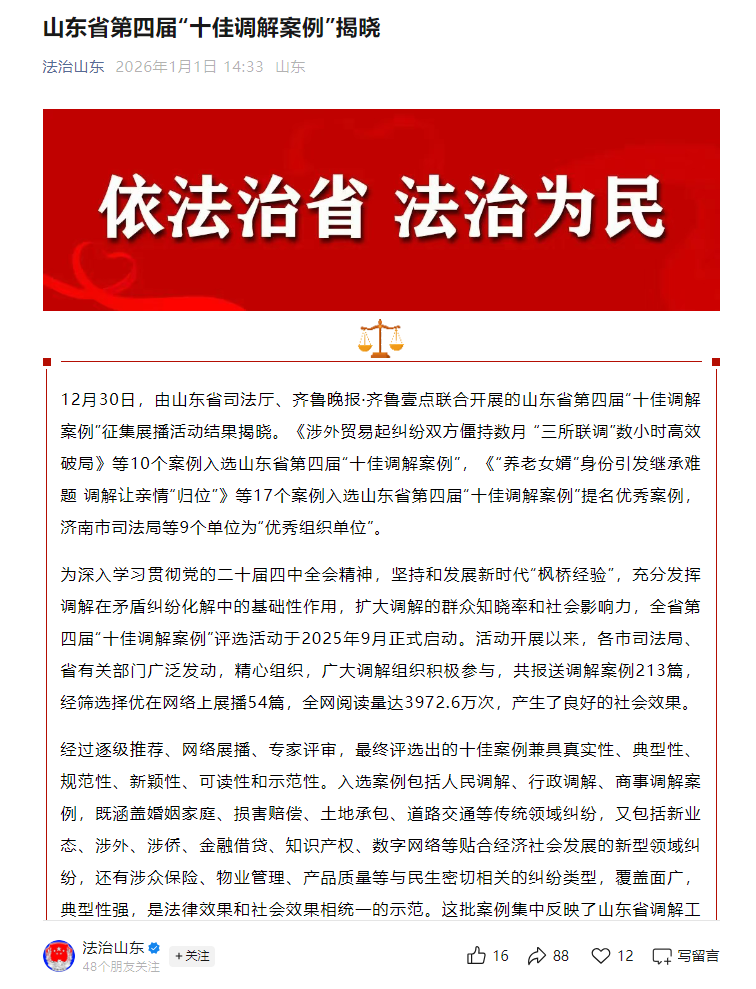 近日,由山东省司法厅、齐鲁晚报·齐鲁壹点联合开展的山东省第四届“十佳调解案例”征集展播活动结果揭晓。我局报送的“用药过量致七十亩豆苗受损,行政调解护民安”,经层层筛选与严格评审,成功入选山东省第四届“十佳调解案例”提名优秀案例。