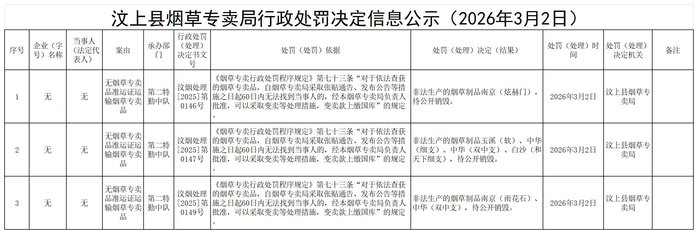 汶上县烟草专卖局行政处罚决定信息公示(2026年3月2日)