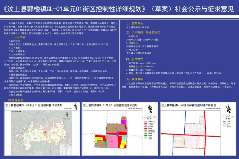 《汶上县郭楼镇GL-01单元01街区控制性详细规划》(草案)社会公示与征求意见