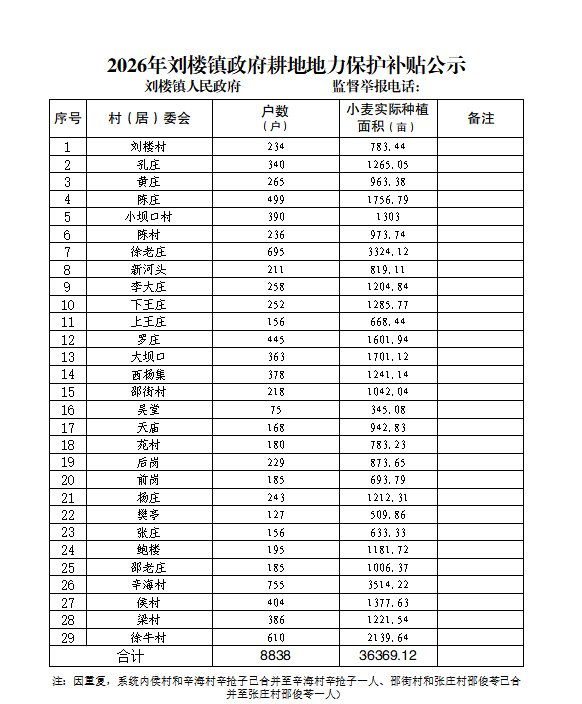 2026年刘楼镇人民政府耕地地力保护补贴小麦种植面积公示