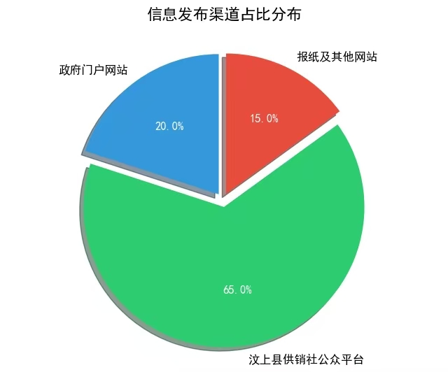 2025年度,主动公开发布各类政务信息40条。其中通过政府门户网站政府信息公开目录推送8条,占总量的20%;“汶上县供销社”公众平台发布26条,占总量的65%;报纸、其他网站等发布6条,占总量的15%。信息主要内容包括供销社提升农业社会化服务水平,完善农村现代流通网络,企业破产善后处理、安全生产等工作。